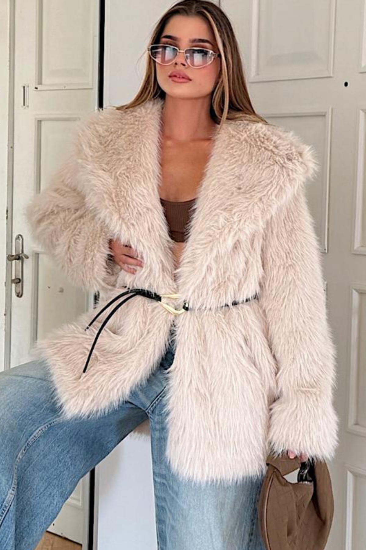 ✨ Kış modasında zarif bir seçenek! Bej kemerli şal yaka kürk mont, feminen ve sofistike bir duruş kazandırır.