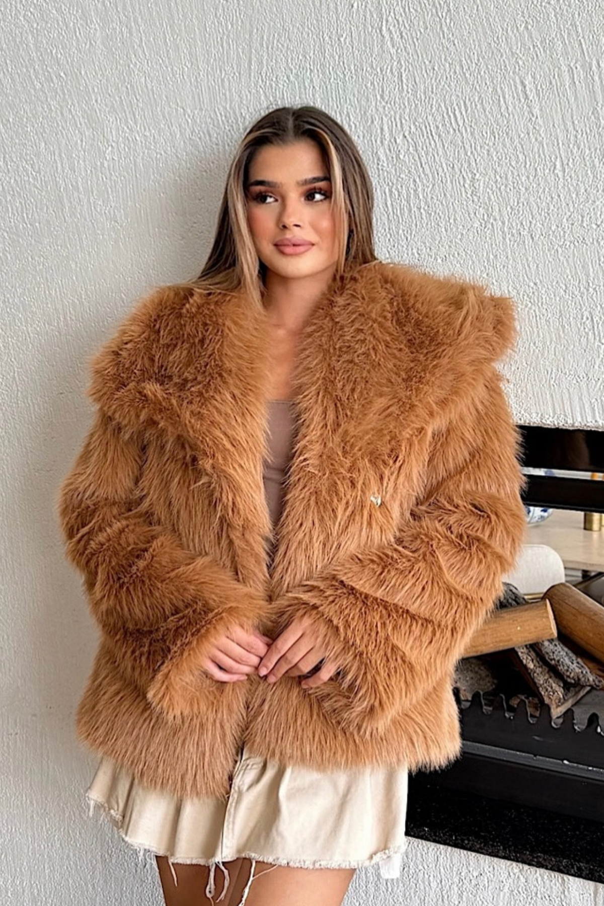 Oversize duruşa yakın rahat kesimi ve klasik camel rengiyle jean, elbise veya kumaş pantolonlarla kolayca kombinlenebilen bu kürk mont, hem günlük şehir stilinde hem de özel davetlerde zarif bir tamamlayıcıdır.