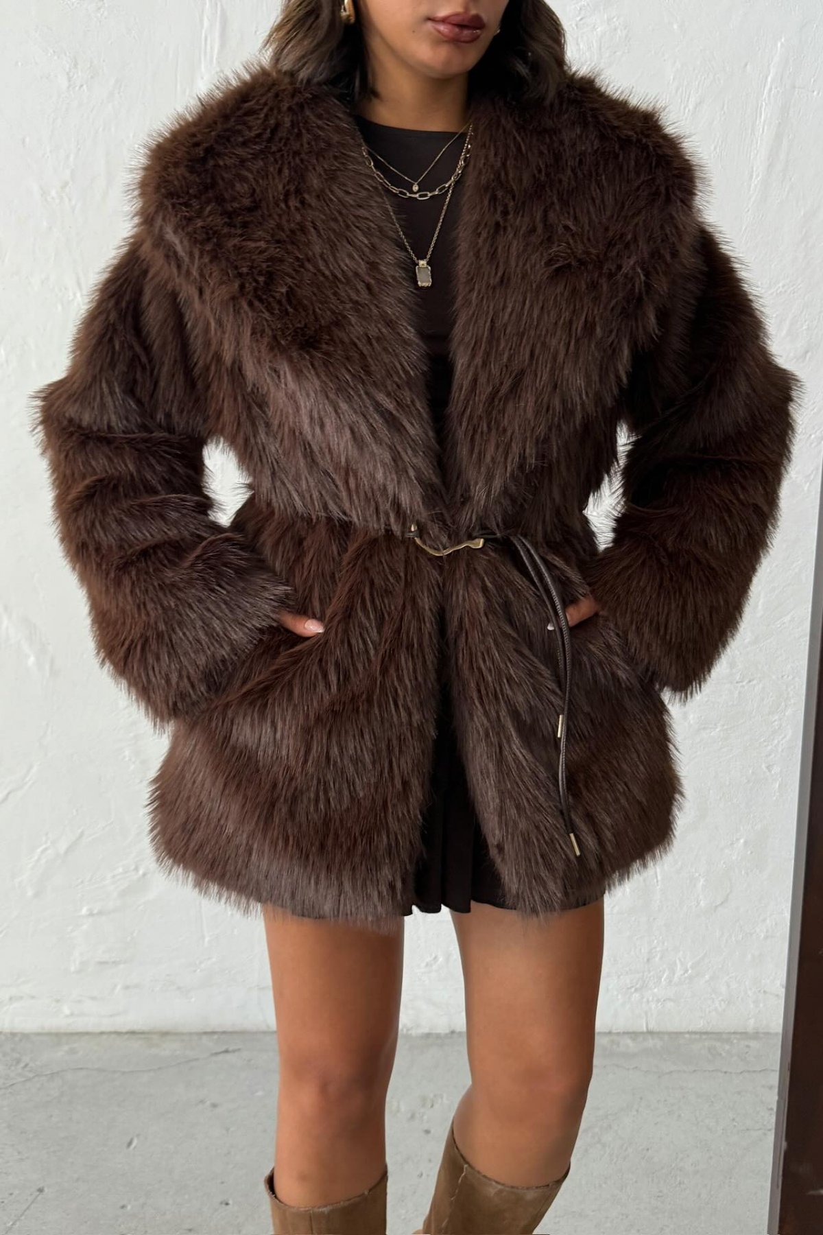 ✨ Sıcak tonların zarafeti! Kahverengi şal yaka kemerli kürk mont, kış kombinlerine doğal bir şıklık katıyor.