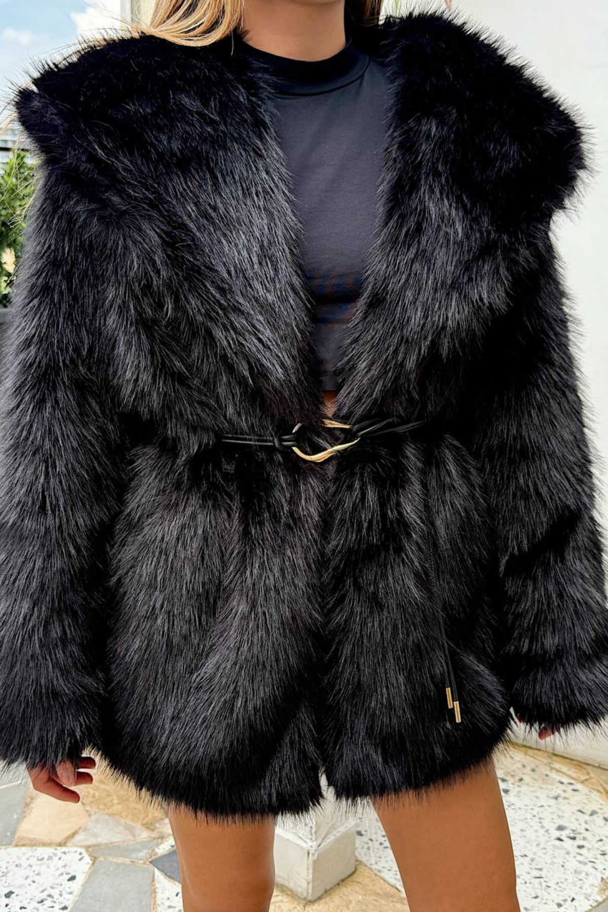 Siyah şal yaka kemerli kürk mont, %100 polyester suni kürk kumaşıyla dayanıklı ve sıcak tutan bir yapı sunar. Çift çıtçıtlı kruvaze kapaması ve belden bağlamalı kemeri, hem vücuda oturan hem de modern bir siluet kazandırır. Astarlı yapısı soğuktan korurken, şal yaka detayı zarif bir duruş sağlar. Günlük kullanımda jean ile, akşam şıklığında elbiselerle kolayca kombinlenebilir.