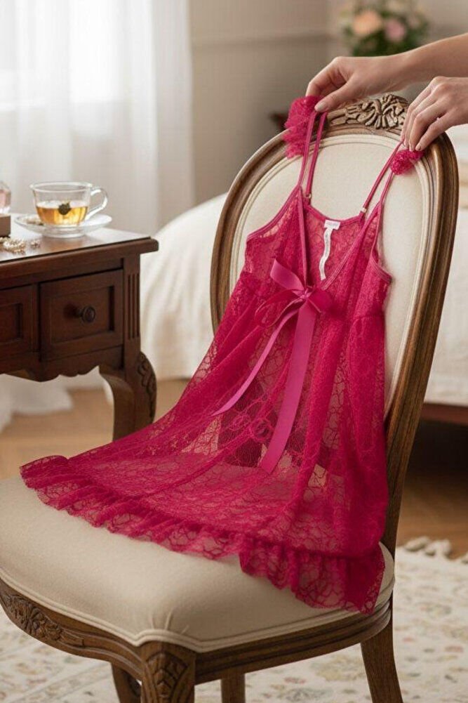 Kadın Fuşya Dantel Askılı Mini Gecelik Takım – Fırfır Detaylı Babydoll, 2 Parça