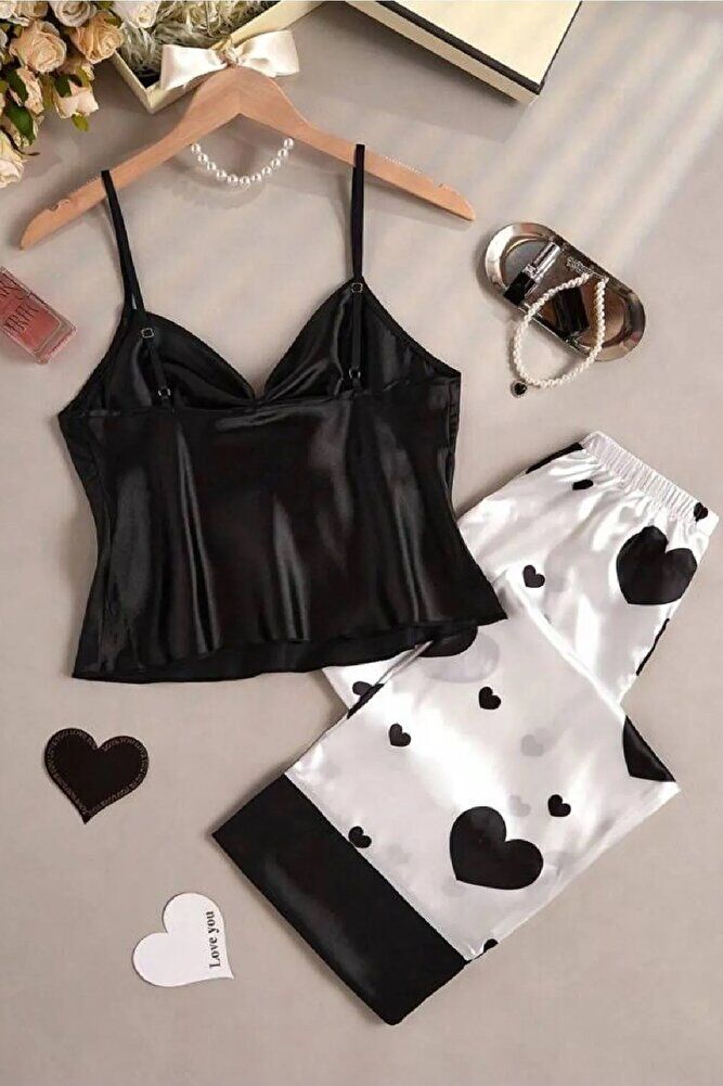 Kadın Kalp Desenli Saten Pijama Takımı – 2 Parça Askılı, Uzun Alt Gecelik Takım Siyah - Beyaz