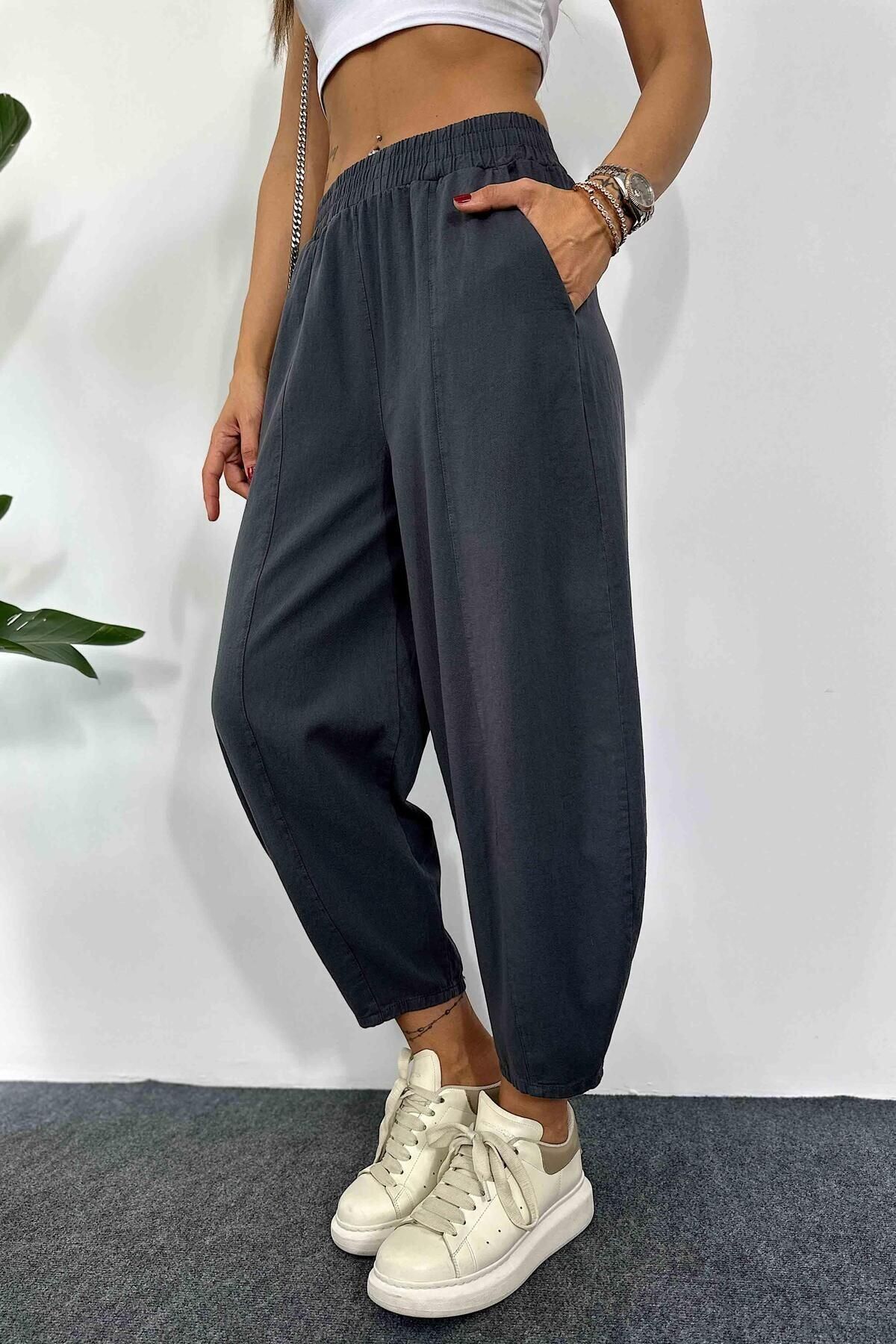 Kadın antrasit şalvar pantolon, günlük yaşamdan ofis kombinlerine, seyahatlerden ev rahatlığına kadar her yerde kullanılabilir.