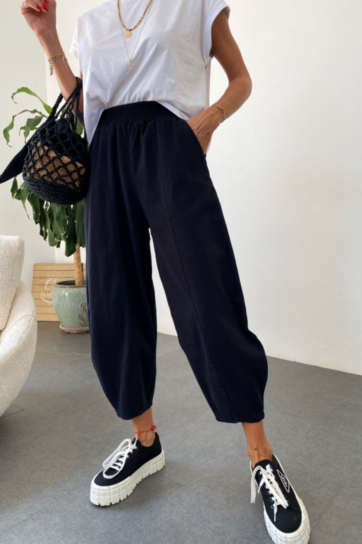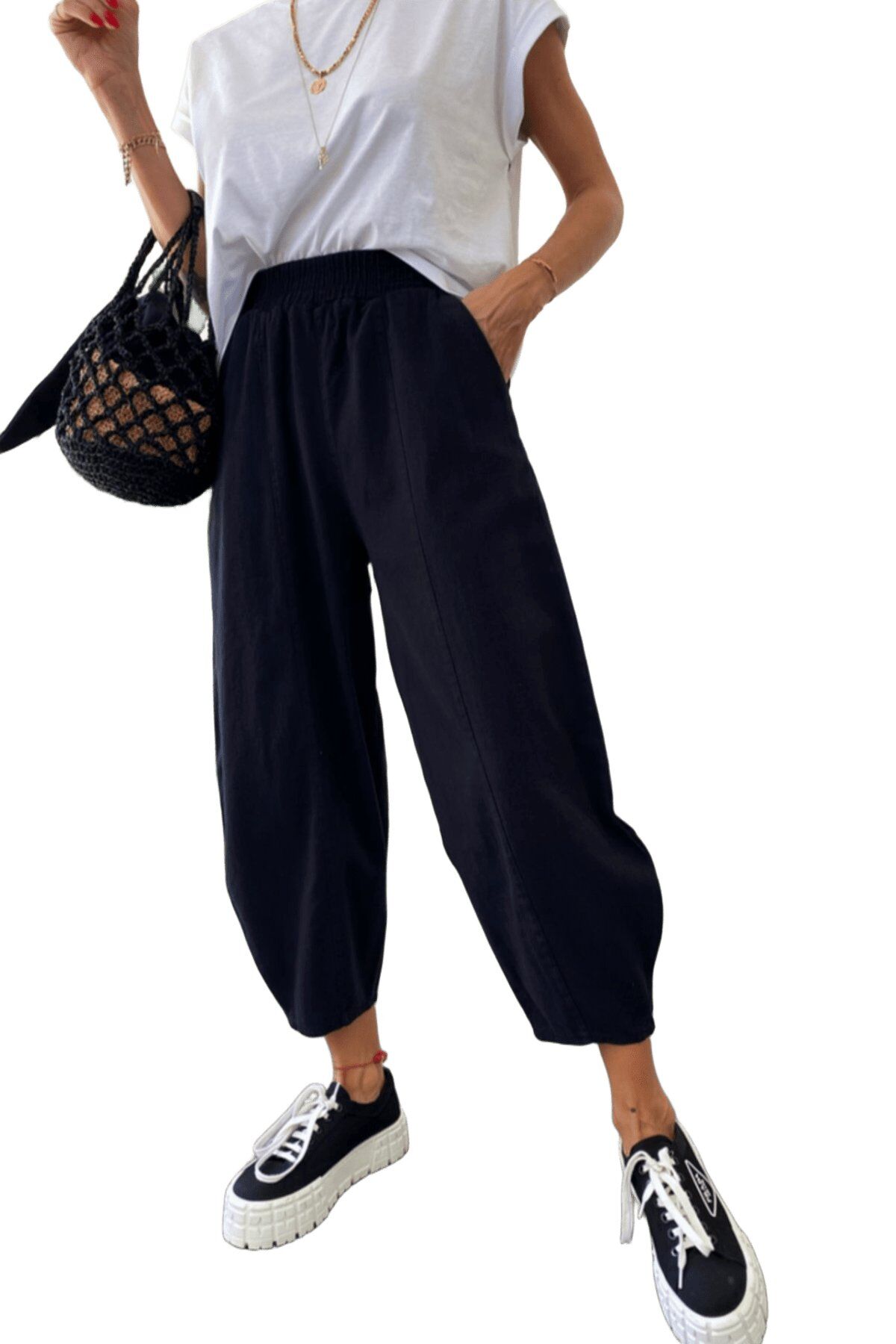 Kadın Siyah Şalvar Pantolon Salaş Baharlık Kışlık Yazlık Mevsimlik Rahat %100 Pamuk Lastikli Bel Günlük Model Gabardin