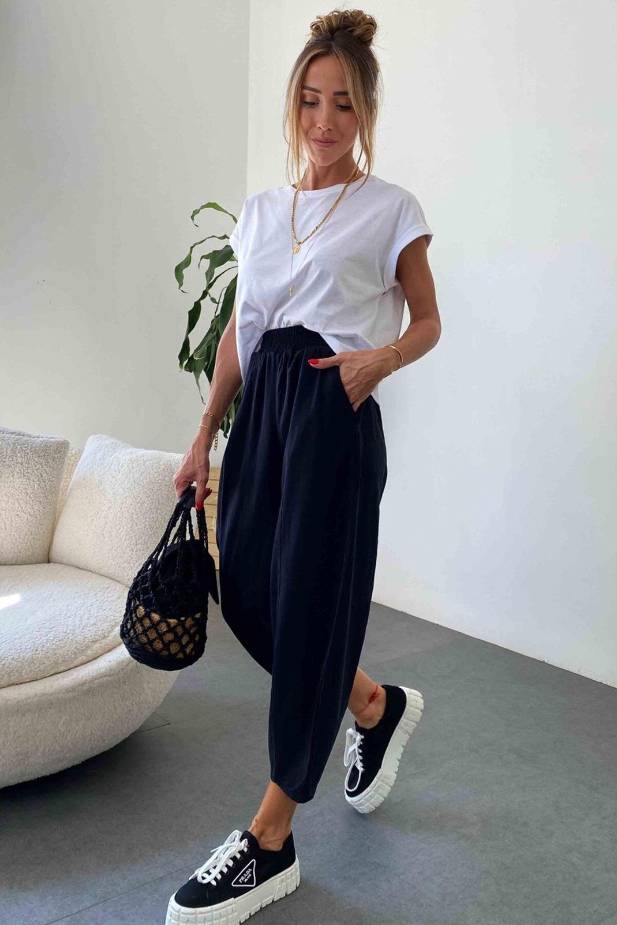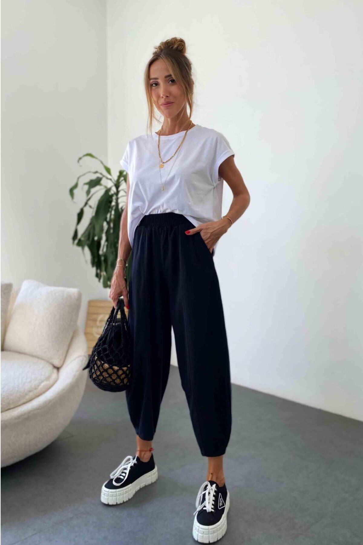 Zamansız şıklığın en rahat hali: Kadın Siyah Şalvar Pantolon, dört mevsim kullanılabilen %100 pamuk gabardin kumaşıyla gün boyu konfor sağlar. Nefes alan, terletmeyen doğal dokusu; bol paça kesimi ve lastikli bel tasarımıyla hareket özgürlüğü sunar. Modern siyah rengiyle her tarz kombinle kolayca uyum sağlar — ister günlük stil, ister ofis ya da tatil rahatlığı.