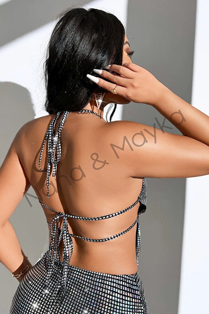 Kadın Simli Taşlı Fantezi Kostüm – Püsküllü Halter Bluz & Mini Etek Parti, Klüp Takımı Gümüş