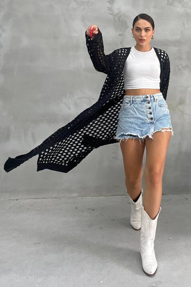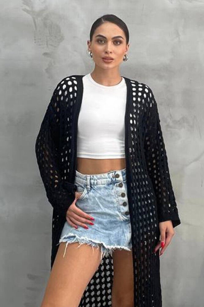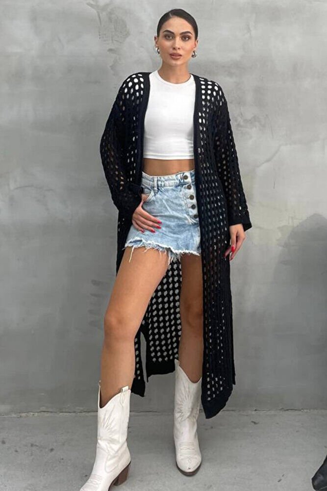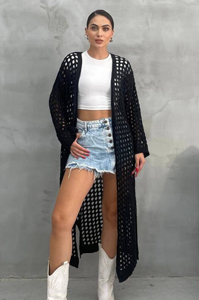 Kadın Siyah Ajurlu Delikli Uzun Triko Hırka – Mevsimlik İnce Akrilik, Yırtmaçlı Model, Şık Rahat Tarz