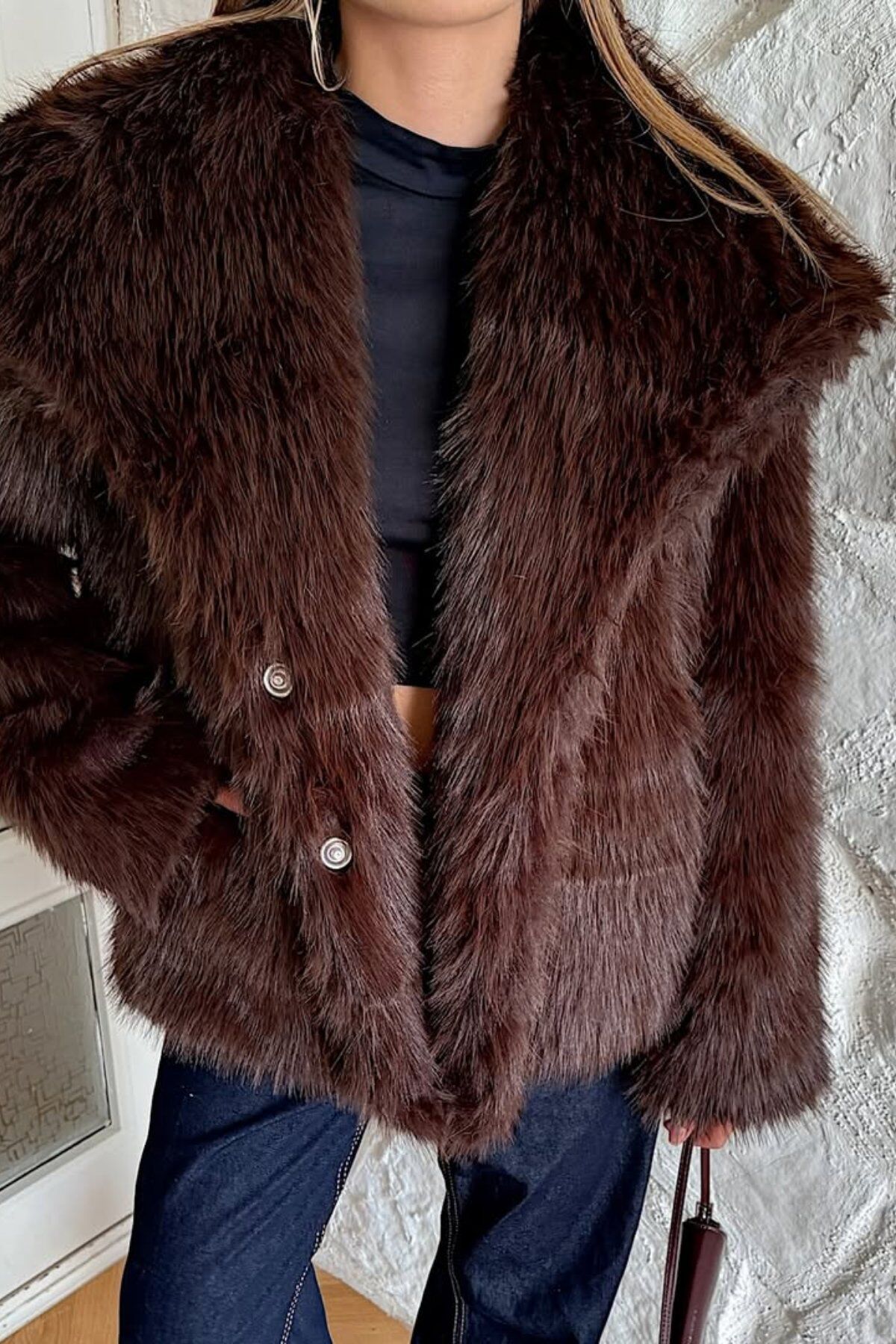 Kadın Suni Kürk Mont Kahve – Şal Yaka, Kruvaze, Çift Çıtçıtlı, Uzun Kollu, Kalın, Rahat Kalıp