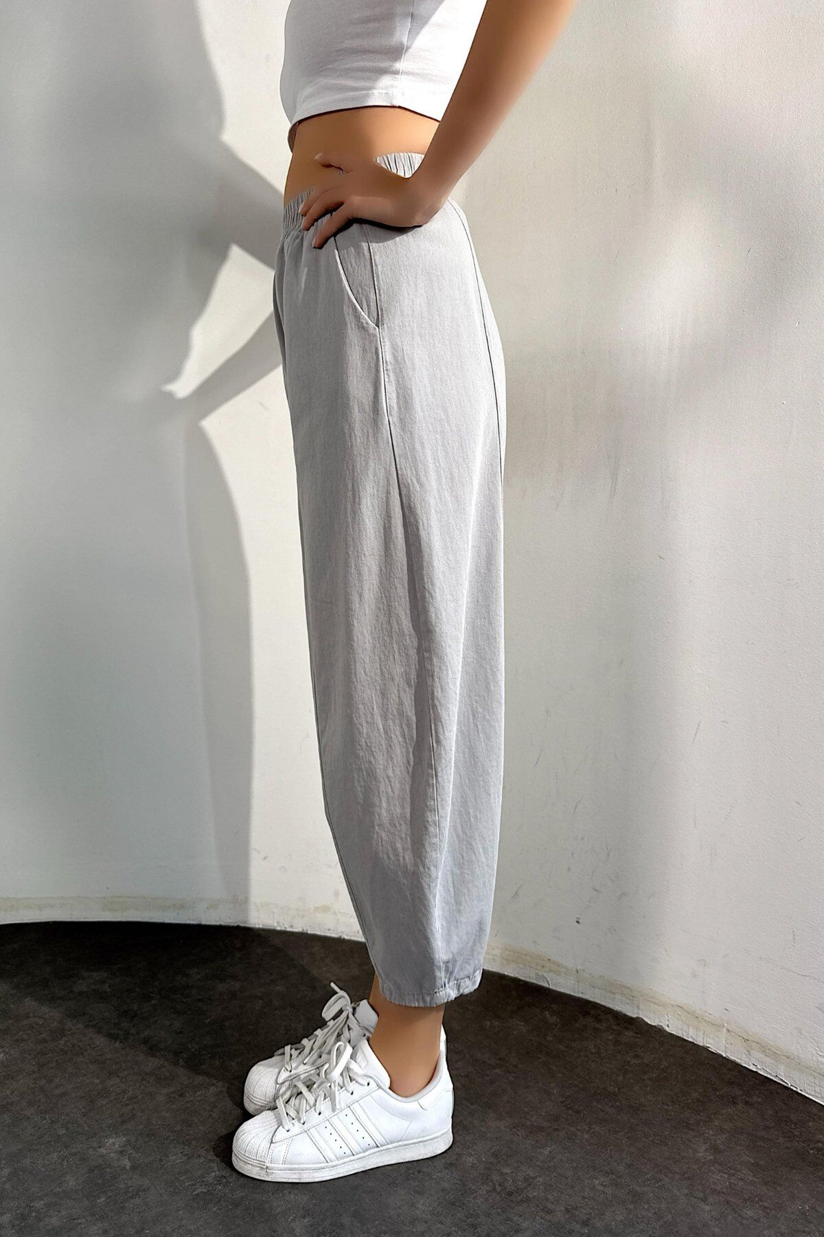 Kadın Şalvar Pantolon – Taş Rengi Yazlık Gabardin Kumaş, Rahat Kesim, Lastikli Bel %100 Pamuk
