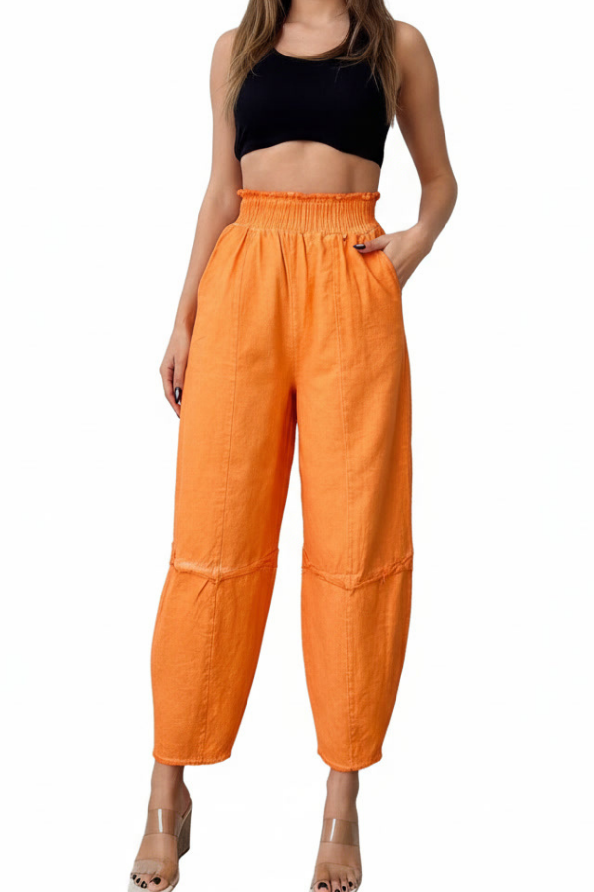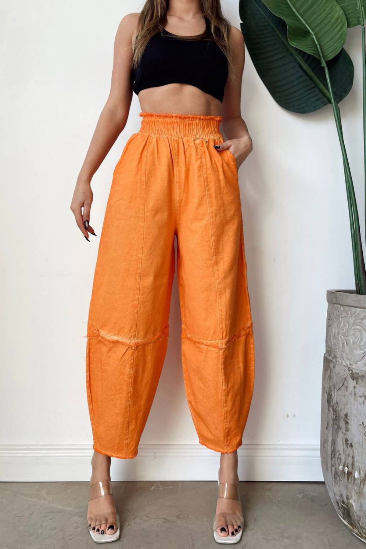 Kadın turuncu yıkamalı eskitmeli şalvar pantolon, kalın lastikli bel yapısı ve ince bel uyumlu salaş kesimi ile rahat günlük kullanım için tasarlanmıştır. Yıkamalı gabardin kadın şalvar pantolon, turuncu renk, salaş model, lastikli bel, dört mevsim rahat pantolon arayanlar için ideal seçimdir.