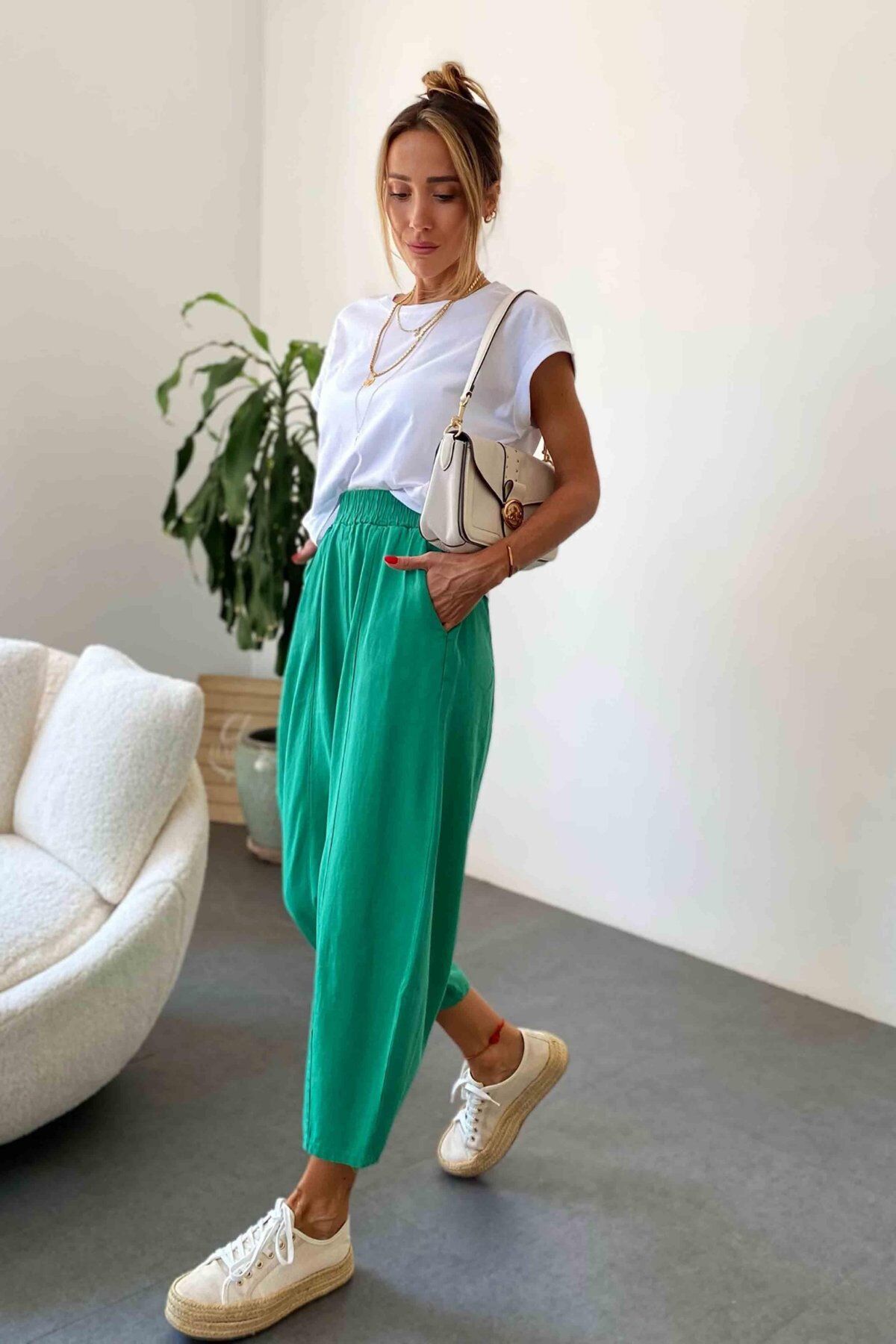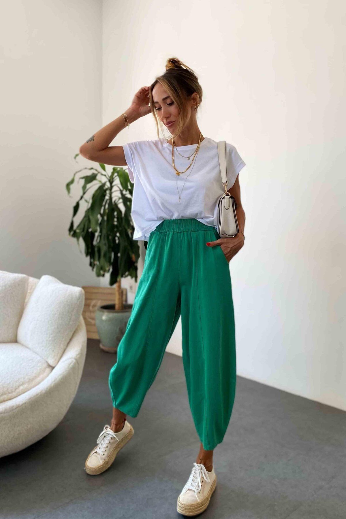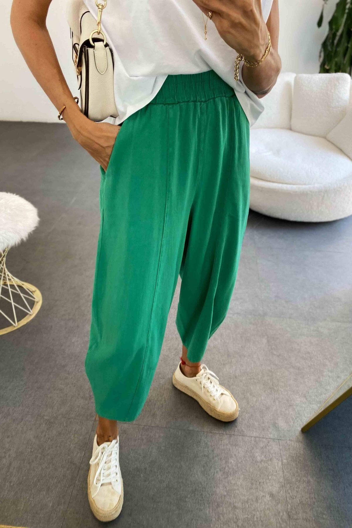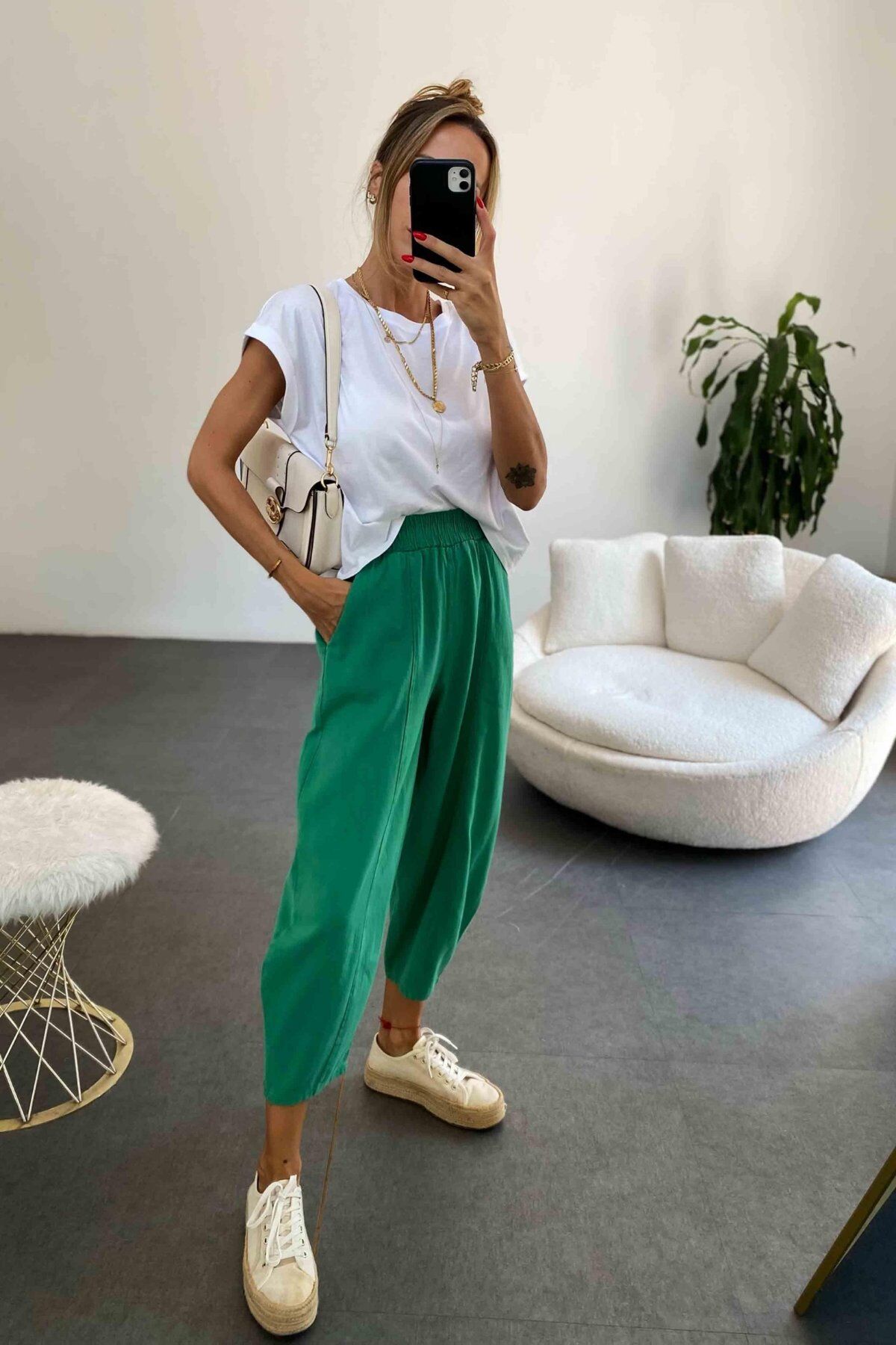 Canlı ama zarif bir görünüm! Kadın zümrüt yeşili şalvar pantolon, %100 pamuk kumaşıyla nefes alır ve dört mevsim giyilebilir.