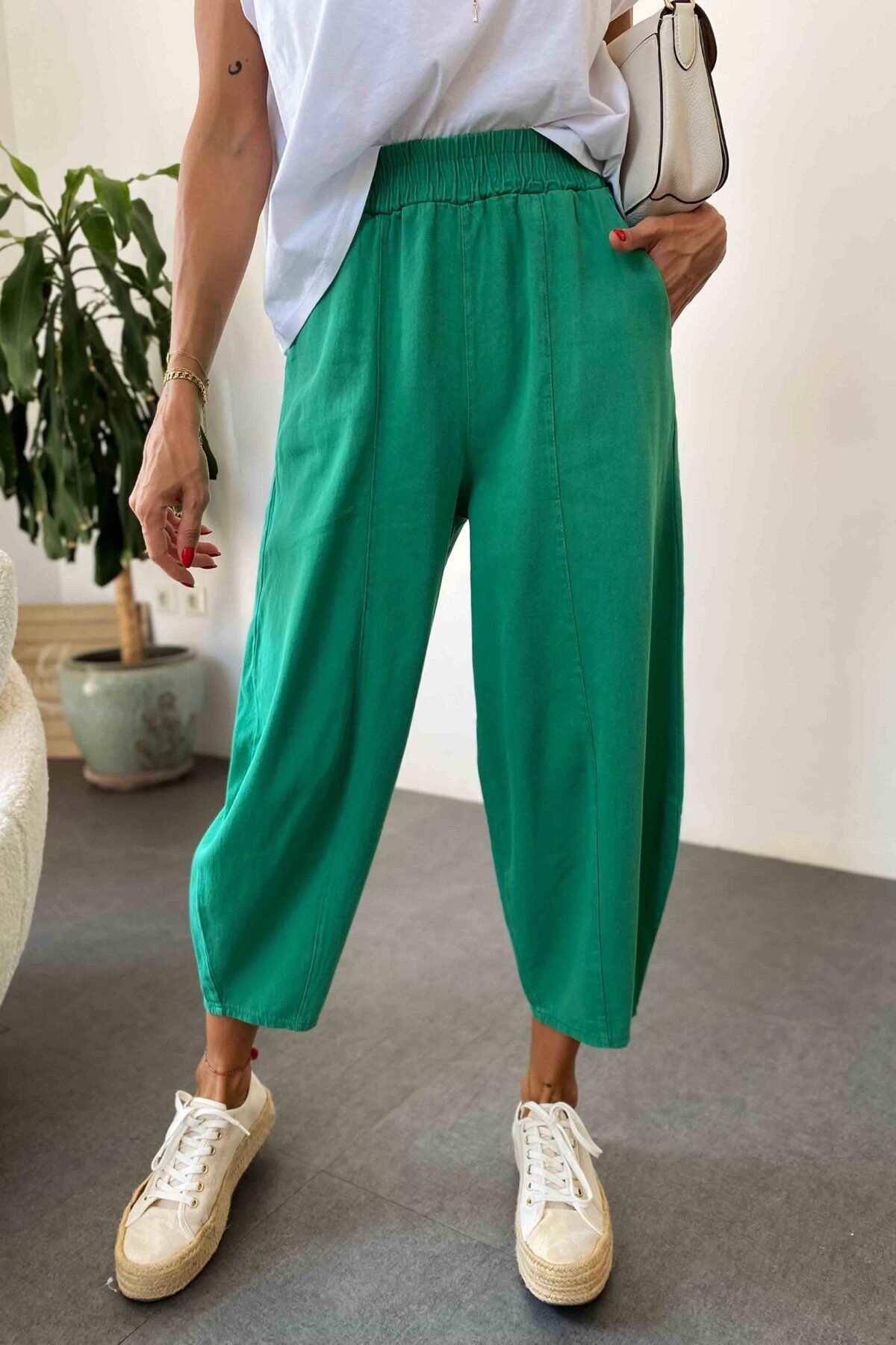 Kadın Zümrüt Yeşili Şalvar Pantolon Salaş Dört Mevsim Rahat Pamuk Lastikli Bel Günlük Model Gabardin