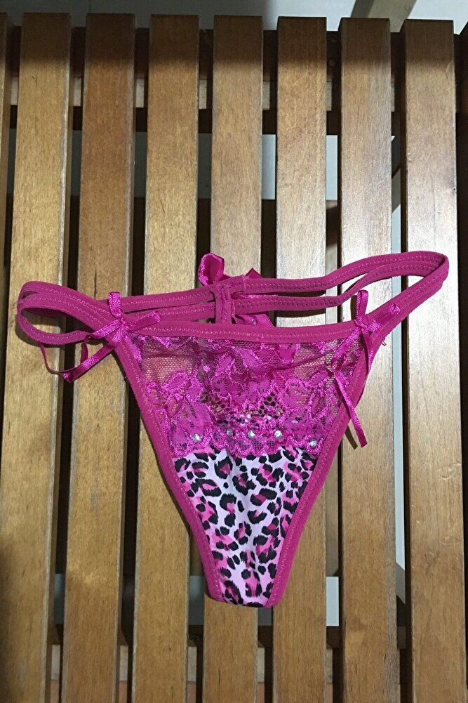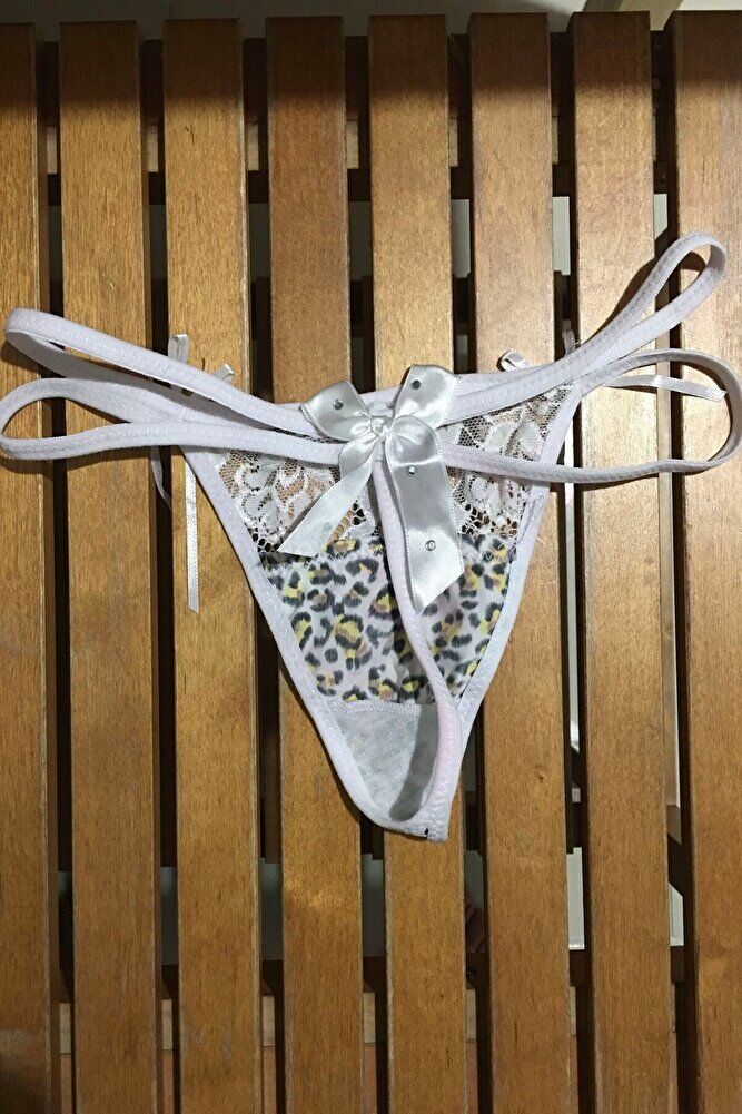 Leopar Desenli Taşlı Fiyonklu Çift Lastikli String Tanga Fantazi Külot XS-S-M