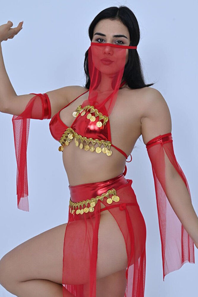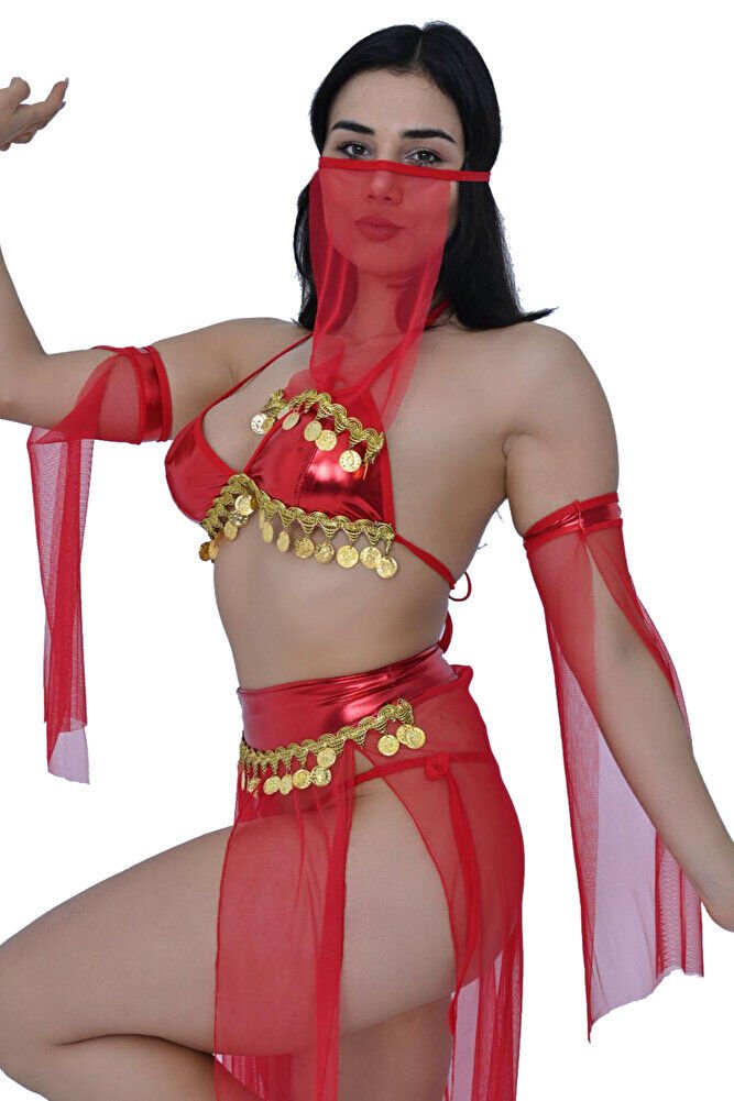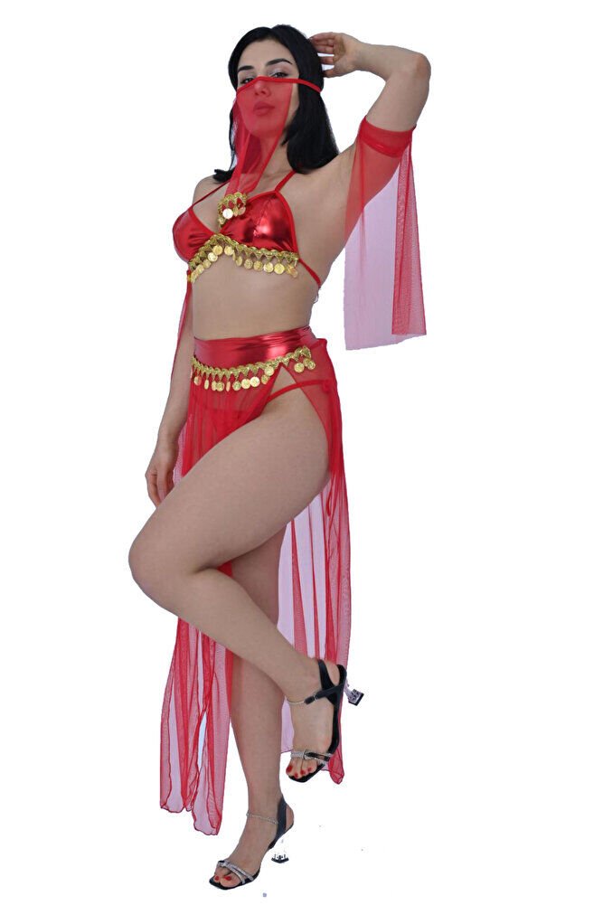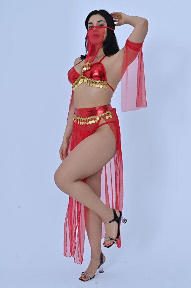 Peçeli Liralı Fantazi Gold Detaylı Tül Fantezi Kostüm Kadın Dansöz Kıyafeti 2504 Kırmızı 5 Parça