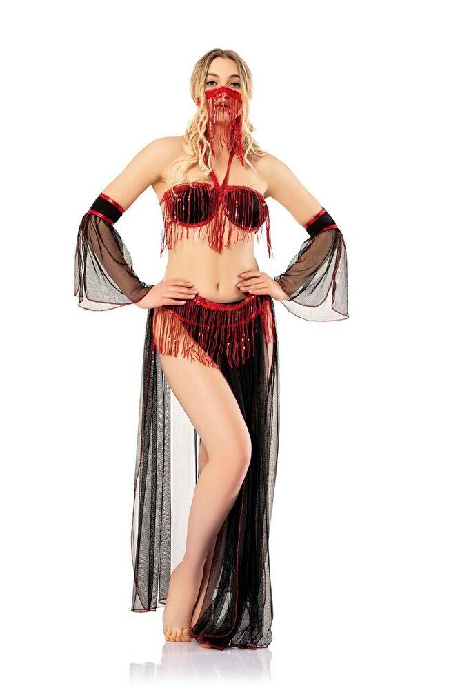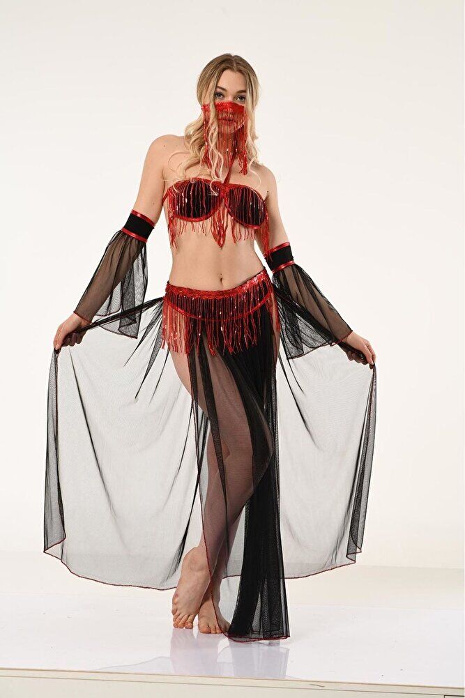 Peçeli Püsküllü Fantezi Gold Detaylı Tül Fantezi Oryantal Kostüm Kadın Dansöz Kıyafeti - Siyah - Kırmızı