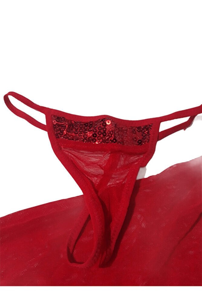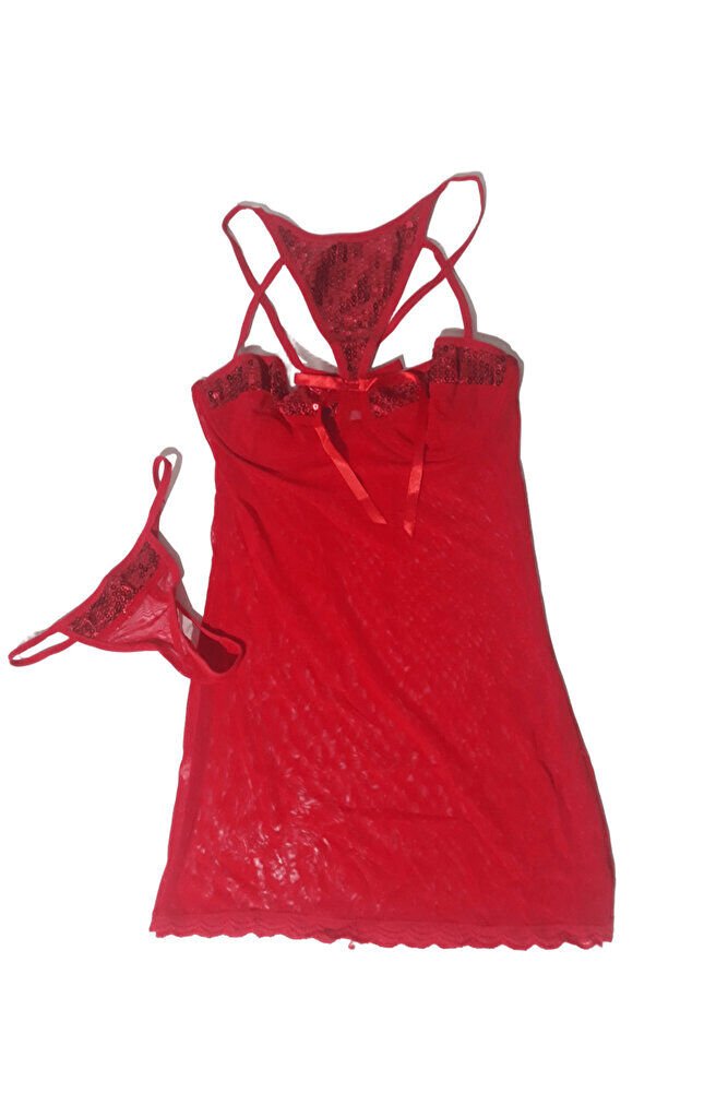Pullu Gerdanlıklı Kadın Fantazi İçgiyim Gecelik Babydoll Takım Kırmızı Yılbaşı SM