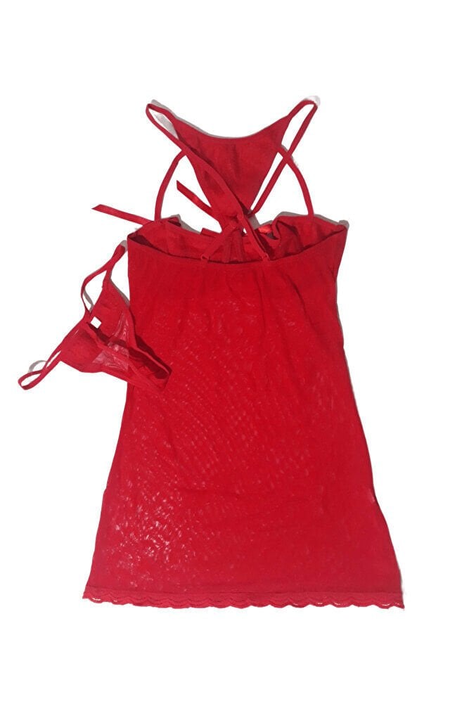 - Kırmızı rengiyle dikkat çeken bu fantazi içgiyim gecelik, yılbaşı gecelerinde şıklığınızı tamamlayacak.; - Askılı tasarımı sayesinde rahat bir kullanım sunarken, derin V üst silueti ile feminen bir görünüm kazandırır.; - Düşük bel kesimi ve string alt silueti ile modern ve çekici bir siluet oluşturur.; - Poliamid ve elastan karışımı materyali sayesinde esneklik ve konfor sunar; hareket özgürlüğünüzü kısıtlamaz.; - Dantel kumaş tipi ile zarif detaylar ekleyerek göz alıcı bir görünüm sağlar.; - S/M bedeni, standart beden aralığındaki kadınlar için idealdir.; - 2'li paket içeriğiyle hem gecelik hem de string içeren tam bir takım olarak gelir.; - Yıkama talimatlarına uygun şekilde bakım yapıldığında uzun süreli kullanım imkanı tanır.; - CN menşei, kalite ve güvenilirlik açısından tercih edilebilir bir kaynak gösterir.