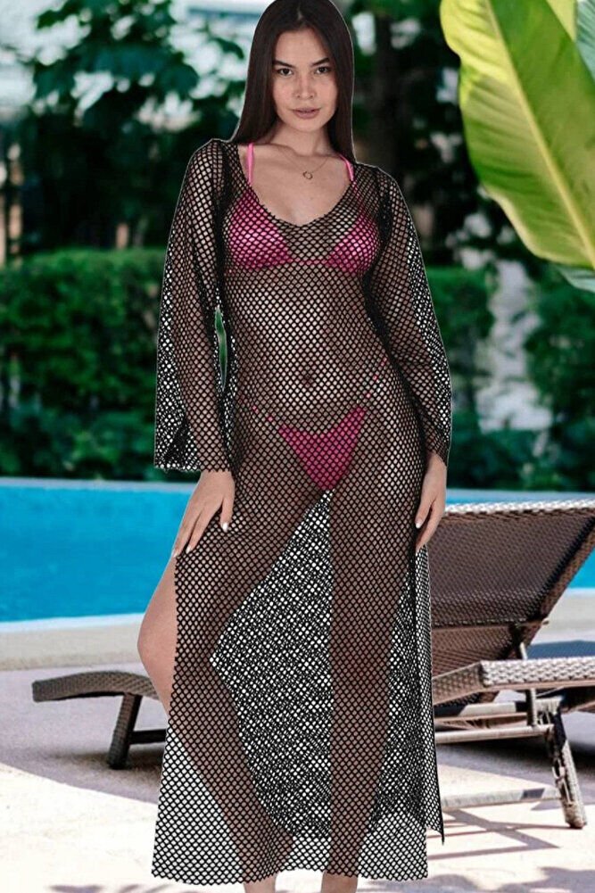 Siyah Geniş File Pareo Elbise, Uzun Kollu, Yırtmaçlı Plaj Elbisesi Standart S-M-L